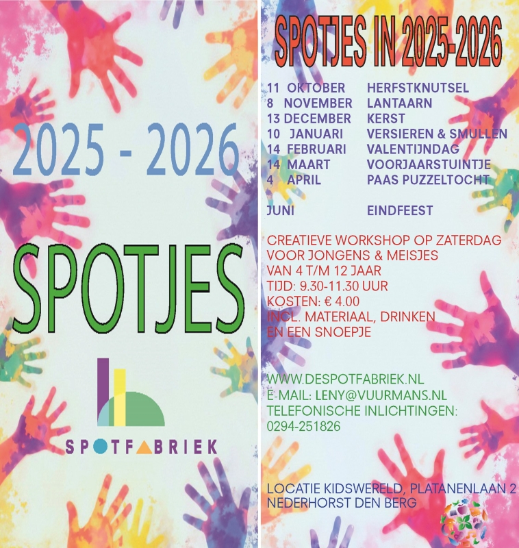 De entree is € 4,00 (incl. materiaal, drinken en snoepje). Spotjes is op de bovenverdieping bij Kidswereld, Platanenlaan 3 (sportcomplex Vreelandseweg).
